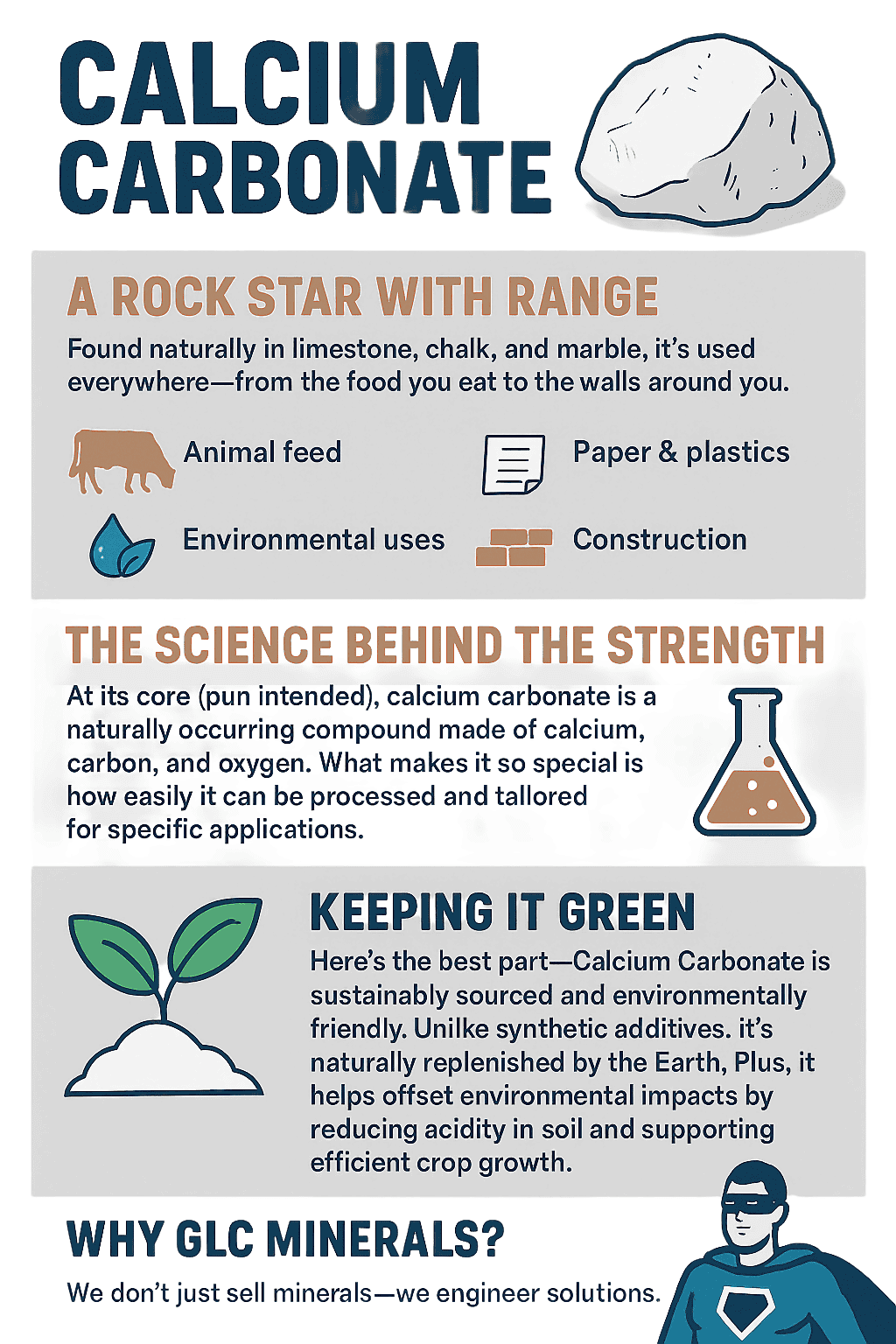 Think Calcium Carbonate is just another rock? Think again. At GLC Minerals, our CaCO₃ is basically the superhero of minerals—showing up everywhere from farm fields to factory floors.