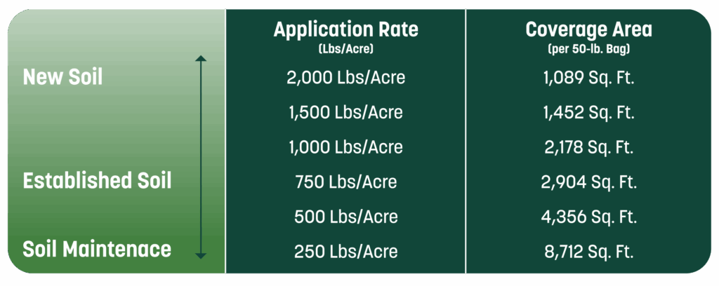 In practice, the user should consider testing the soil to determine the existing pH and mineralization. Testing will typically identify the current soil pH with recommended corrective soil amendments and application rates. UltraCal can be tilled into the soil or broadcasted over the top of the soil surface based upon application and plant requirements. The table below provides General Application Rates.